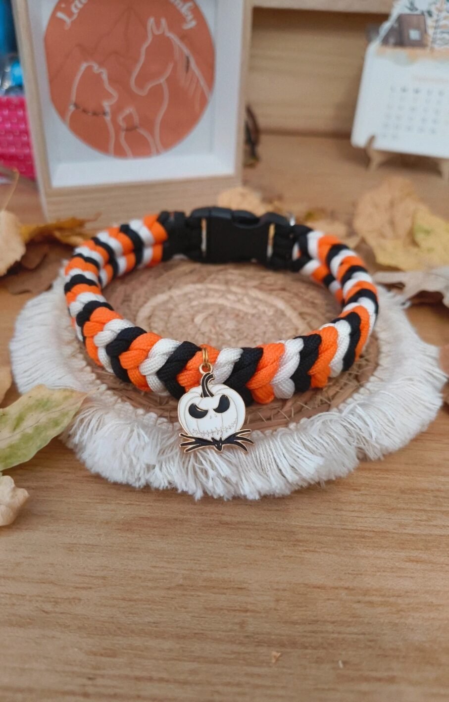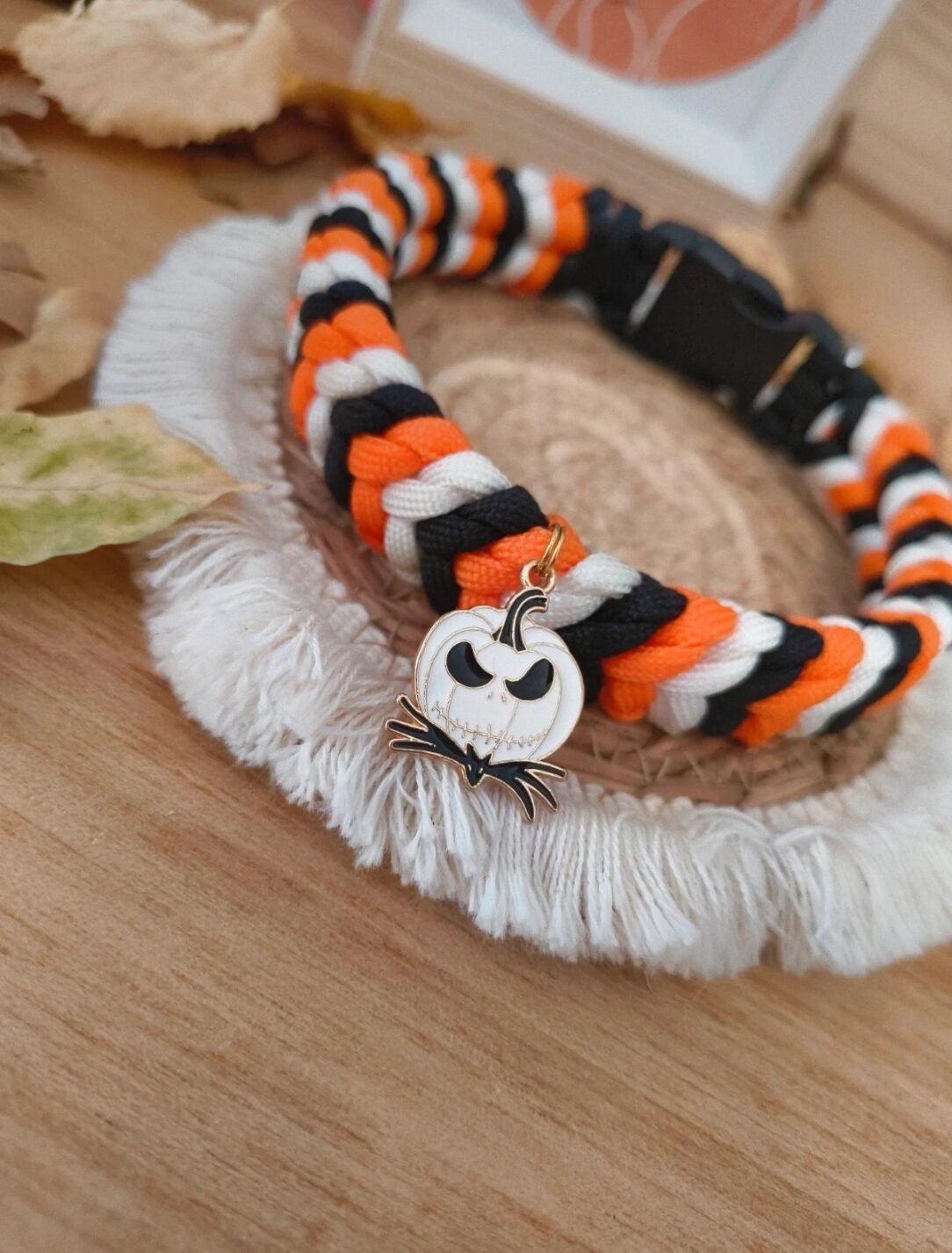 Donnez à votre compagnon un look unique et plein de caractère avec ce collier fait main, orné d’un pendentif citrouille Jack Skellington 🕸️. Parfait pour les balades d’Halloween… ou pour afficher son style décalé toute l’année !